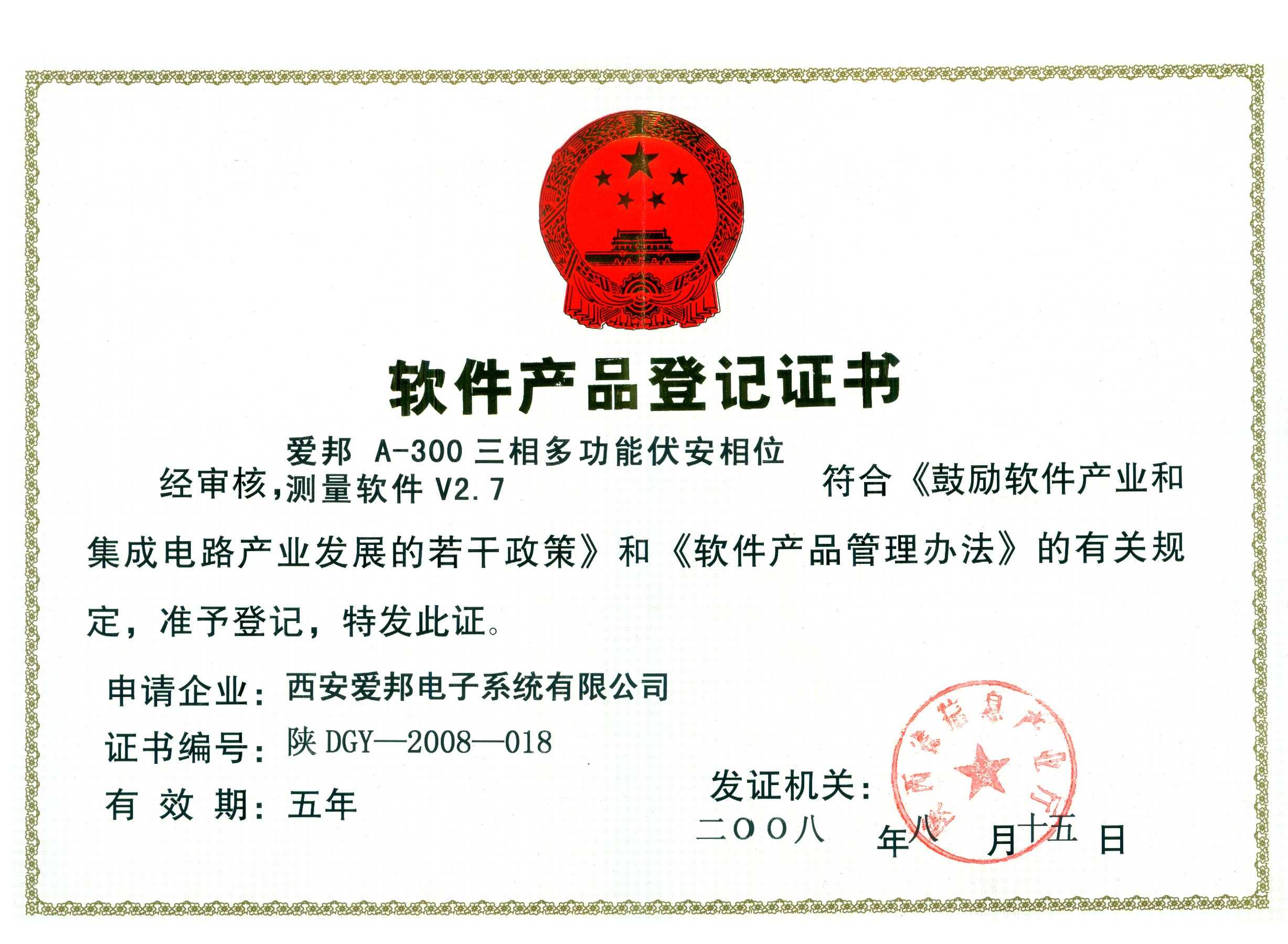 • 軟件產(chǎn)品登記證書(shū)
